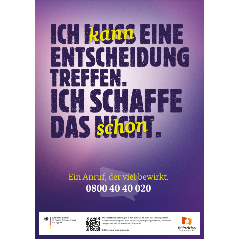 Lassen Sie sich ergebnisoffen vom Hilfetelefon für Schwangere in Not beraten oder wenden Sie sich direkt an eine der bundesweiten Schwangerschaftsberatungsstellen. Sie müssen nicht die nächstgelegene Schwangerschaftsberatungsstelle wählen, sondern können den Ort frei wählen – falls Sie befürchten, gesehen oder erkannt zu werden.